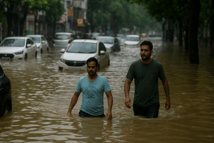 Heavy rains lashed Delhi-NCR on Tuesday night, leading to severe waterlogging and flooding across multiple regions, with Noida among the worst affected. Several residential sectors, including parts of Sector 18, Sector 62, and Sector 121, reported submerged streets, making it difficult for commuters and residents to move around.